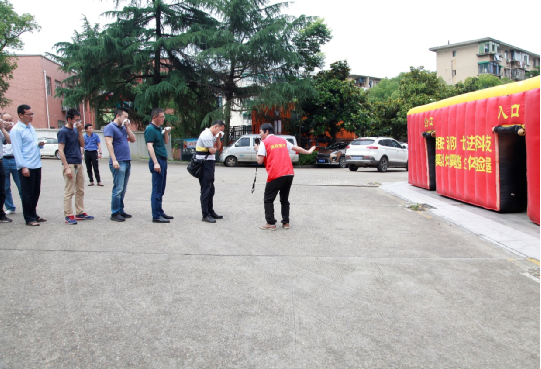 会后,公司组织体验了灭火演练以及帐篷逃生。目前市场上最适合家庭使用的是水基灭火器,它的最大优点不会对物体产生污染,可以直接喷射在人体身上,避免火焰对人体造成伤害。使用方法非常简单,一提、二拔、三握、四压。帐篷逃生的过程中,辅导员教导我们右手扶着墙面感受温度,左手用湿纸巾捂住口鼻,观察脚边的安全指示灯,半蹲前行。大家依次排队进入帐篷中,感受了模拟火灾现场的逃生情境,进一步提升我院职工消防自救、互救技能。