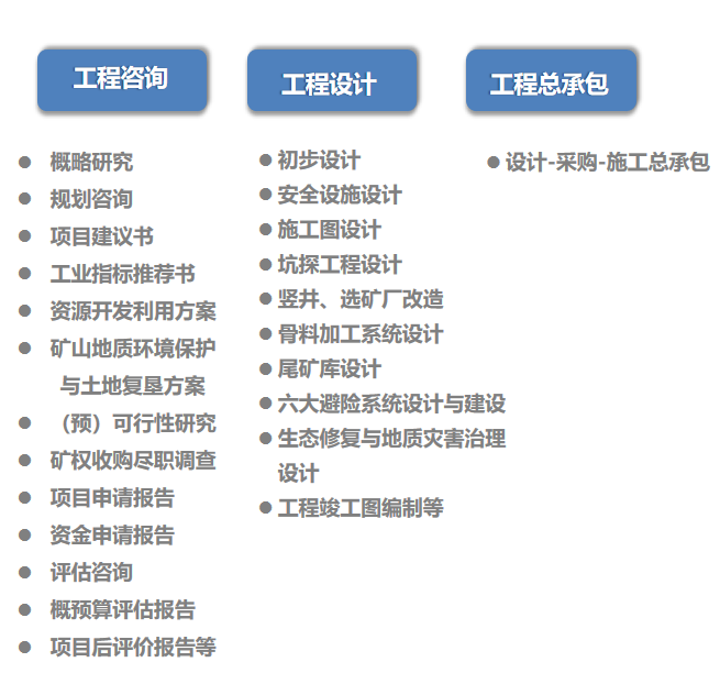 工程设计院持矿山工程设计、咨询双甲级资质,依托长沙矿山院70年采、选、尾技术研究,发挥研究院多年积累的技术优势,设计与科研紧密相连,将科研成果转换为工程设计成果。